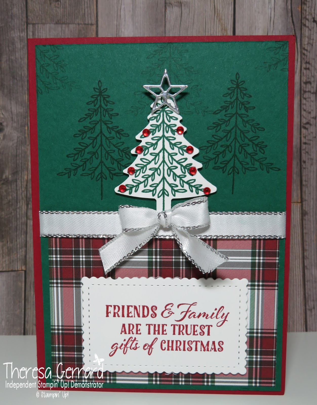 The stamp set is Perfectly Plaid and is matched with the Pine tree punch. The DSP is from a new pack called Plaid Tidings that will be available from next week. I really love this sentiment and it is also from a new offering available from 1st August called Wrapped In Christmas and it is all lovely sentiments. Once again I have added in some bling to the Chrismas tree by adding Red Rhinestone basic jewels and topped the tree with a star cut from silver foil using the Stitched Stars dies.